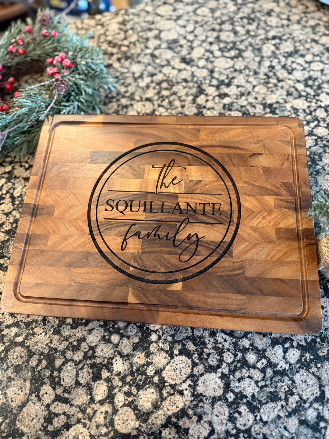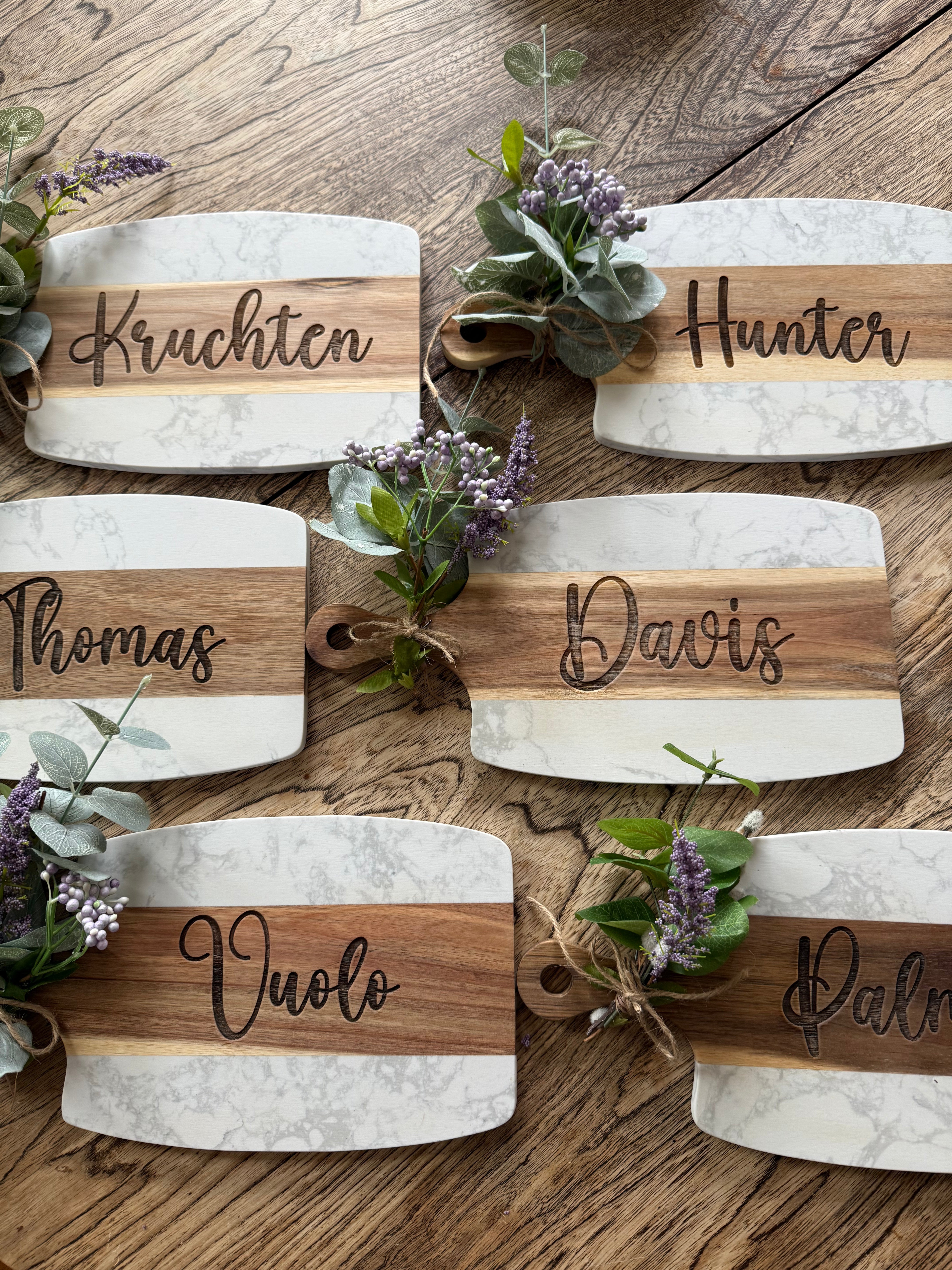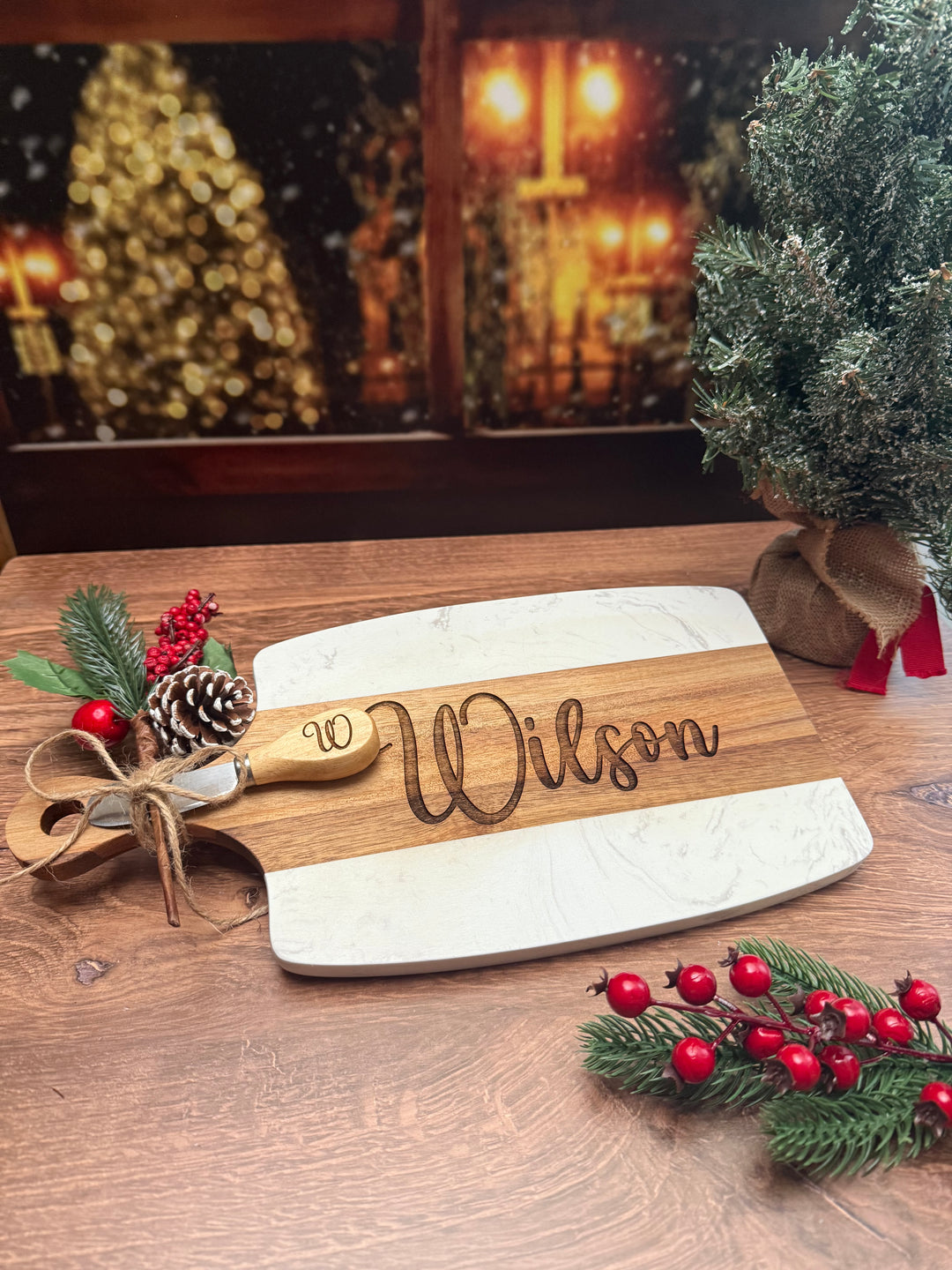 Custom engraved cheese and cutting boards with some Holiday flare. Perfect for Hostess Gifts or any gift where you want that special personal touch.
