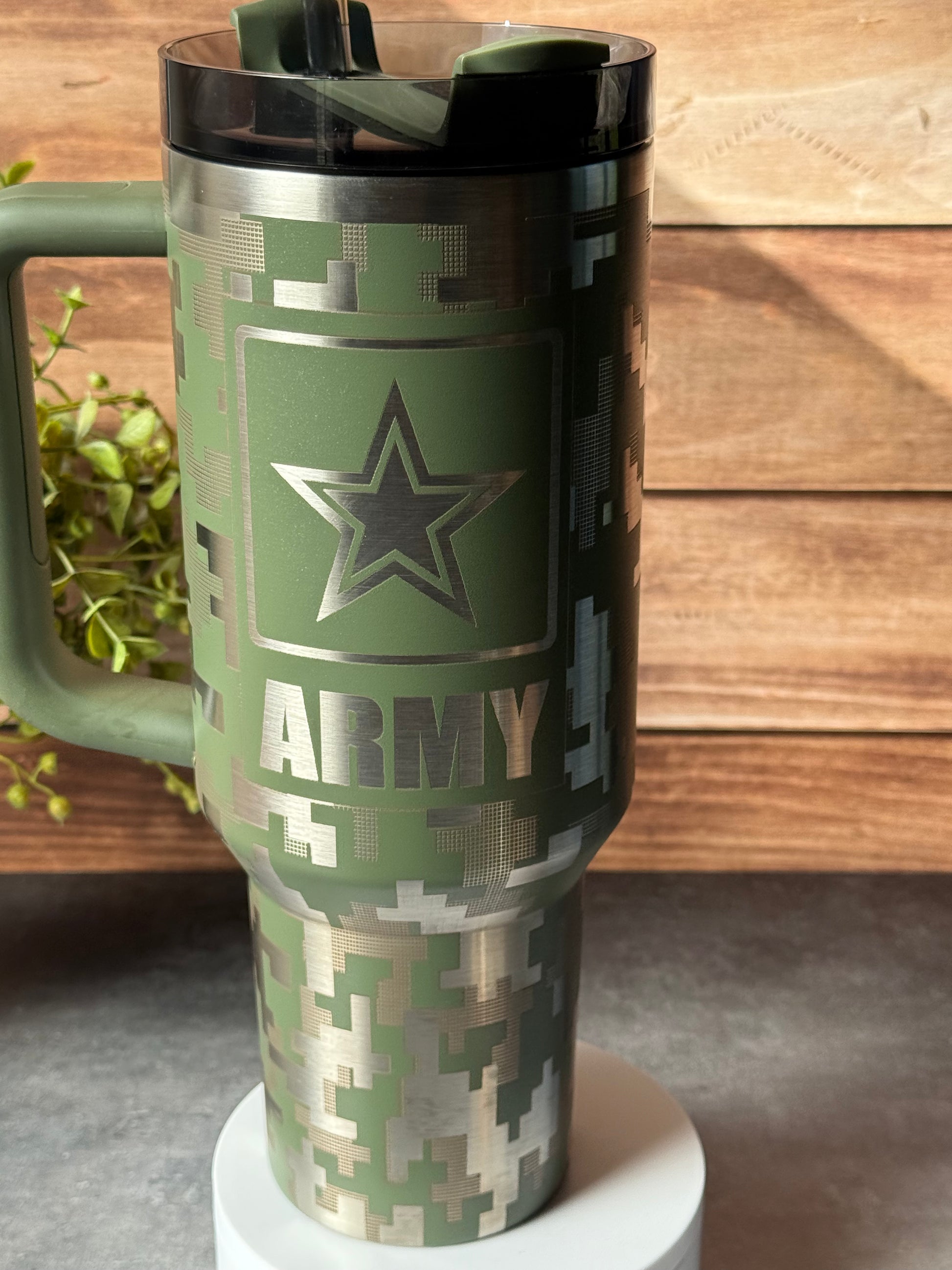 have an army Veteran in the family or a high school grad heading to the Army? make this their new favorite cup! laser engraved for over 40 minutes - this is a one of a kind tumbler made for your special warrior! images shown engraved in dried pine color. add a name on the opposite side for no additional charge!