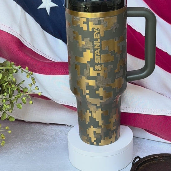 have an army Veteran in the family or a highschool grad heading to the military? make this their new favorite cup! laser engraved for over 40 minutes - this is a one of a kind tumbler made for your special warrior! this is a special edition stanley protour cypress green tumbler that engraves to a gold color. quantities are extremely limited - order soon - these will sell out.